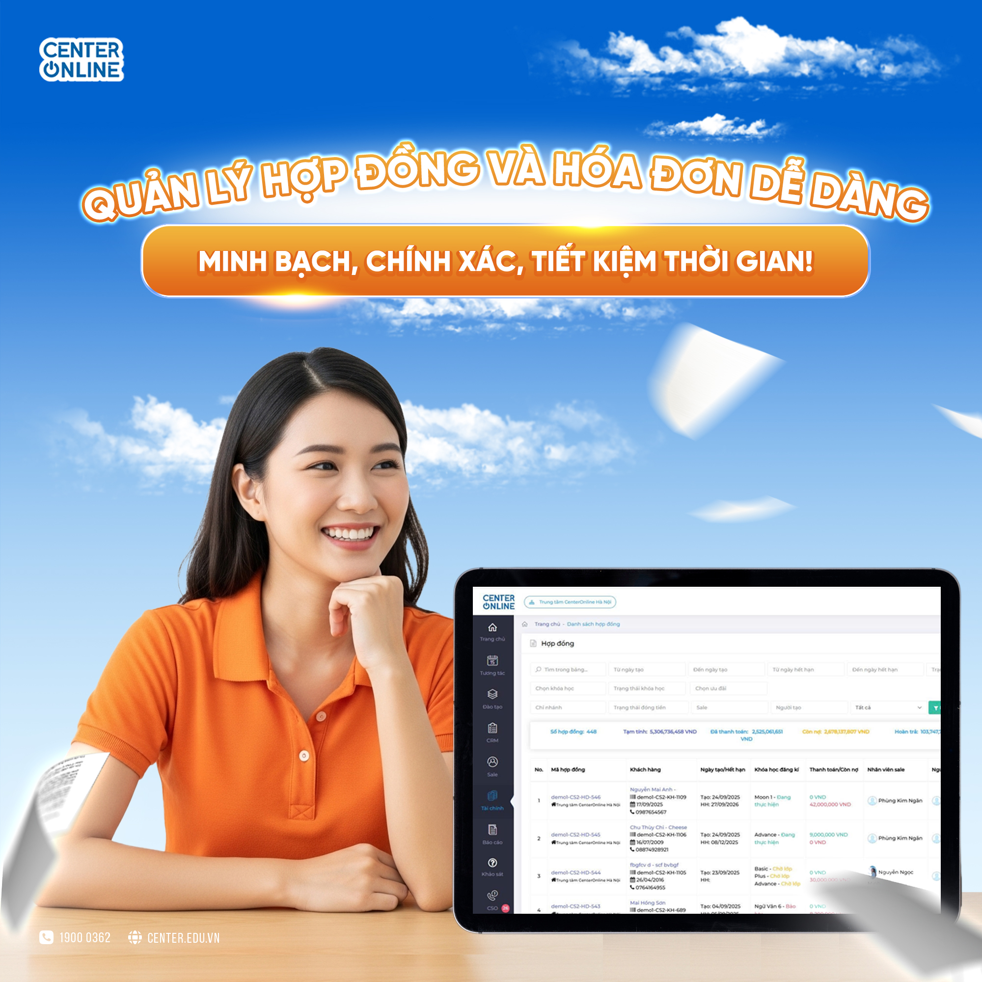 Tính năng Quản lý hợp đồng và hóa đơn của CenterOnline là giải pháp toàn diện giúp các trung tâm giáo dục chuyên nghiệp hóa quy trình quản trị – từ tài chính, CRM đến báo cáo.